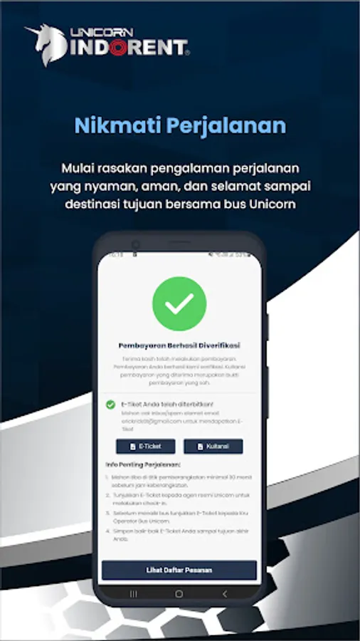Unicorn is a bus company (PO) under the auspices of PT. Wahana Indo Trada Mobilindo is a subsidiary of PT. CSM Corporatama (INDORENT) which is one of the largest rental companies in Indonesia, Established in 2021, Unicorn serves Inter-City Inter-Provincial (AKAP) transportation on the Jakarta - Yogya route and presents buses with the best class and service with double decker units supported by Volvo B11R chassis makes your trip comfortable, safe and memorable.