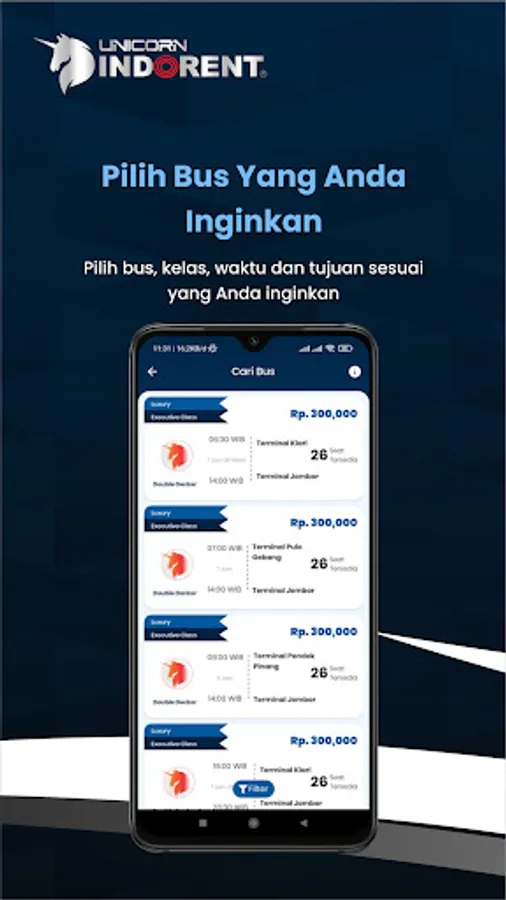 Unicorn provides premium class services at competitive prices, our fleet is equipped with the best facilities, implements health protocols, and each of our fleets uses a Volvo B11R Double Decker bus which makes your trip more comfortable, safe and memorable to your destination. In addition, we also provide easy ticket reservations through a web-based system that you can access anytime, anywhere and on any device.