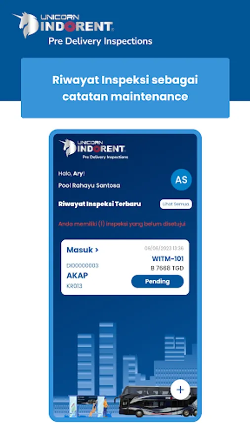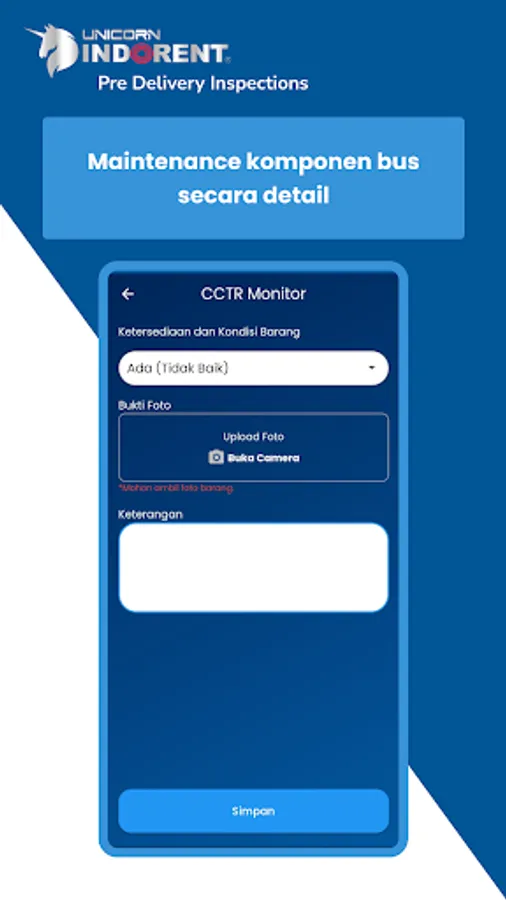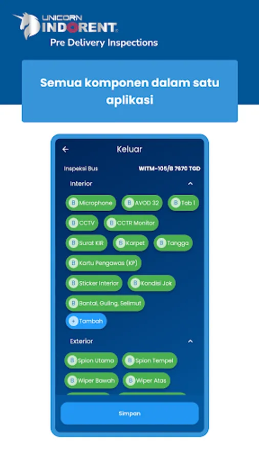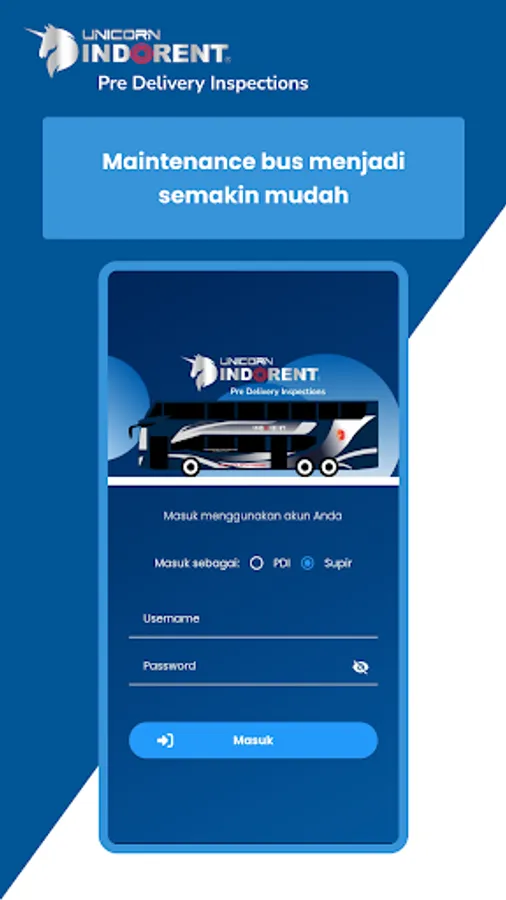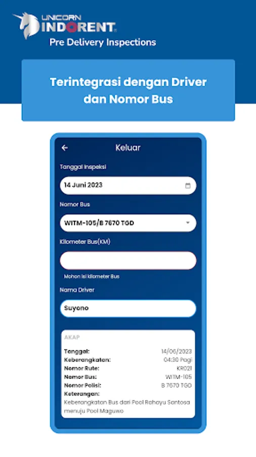 Unicorn PDI is here to make it easier for mechanics to maintain Unicorn Indorent Buses. There is a feature where mechanics can check and record the condition and condition of the Unicorn Bus, so that the quality and maintenance of the bus is maximized in operation.