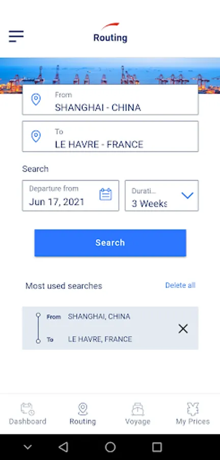 Use the CMA CGM App to search for specific vessel schedules, voyages, or use our routing finder. Directly plugged to the CMA CGM’s Information System, the App will provide information and optimized routing solutions from among more than 200 shipping lines and over 500 vessels calling 420 ports all around the world.