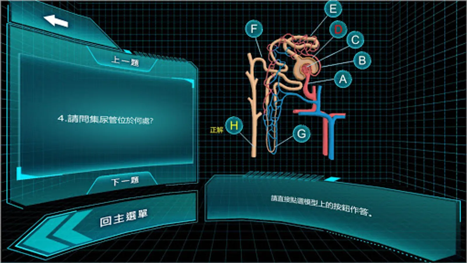以虛擬實境(VR)教材呈現泌尿系統位置、腎臟構造、腎元各部位構造、尿液形成歷程,並出題、設計評量,讓學生以點選方式選取正確選項。