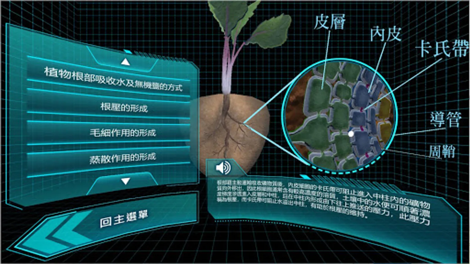 使學生能透過虛擬實境(VR)教材,認識植物體內水和礦物質運輸的基本構造、基本原理,以及植物體內水和礦物質運輸過程中,各動力彼此間的交互關係。
