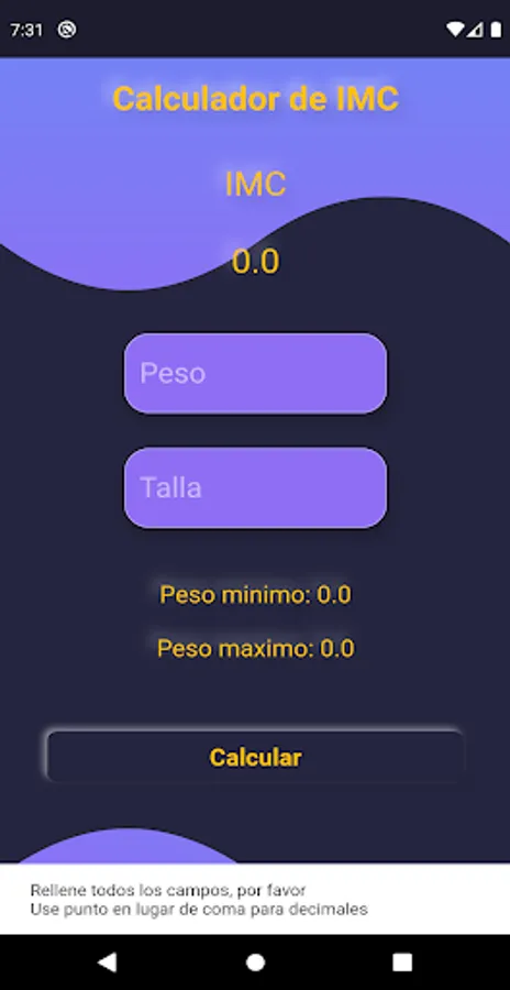 This application allows to quickly calculate the BMI, and gives the recommended weight in which the person should be, as well as its classification according to the result of their BMI