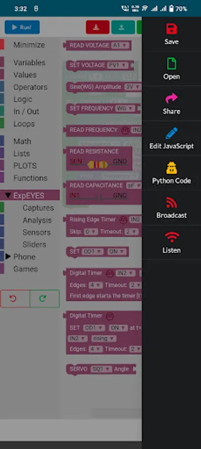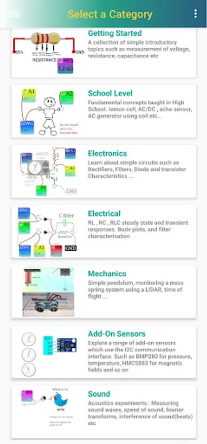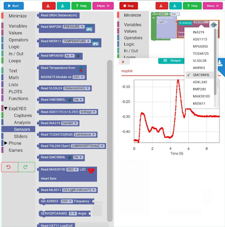 This is a companion app for a feature packed modular hardware(SEELab3 or ExpEYES17) that contain a host of test and measurement tools ranging from a 4 channel Oscilloscope, RC Meter, and frequency counters, to modular communication buses which read data from a multitude of sensors pertaining to physical parameters such as luminosity , magnetism, motion etc.