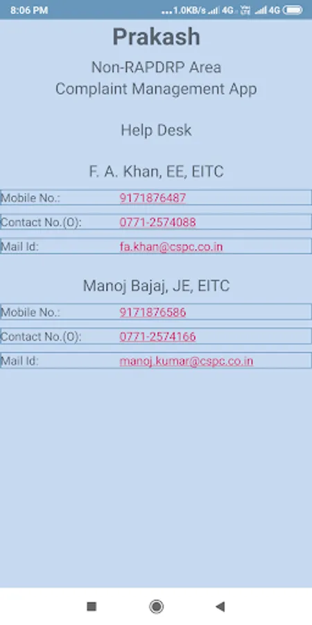 विद्युत शिकायतों के निराकरण हेतु फील्ड में पदस्थ कनिष्ठ अभियंता (टी. एंड डी.) के लिए मोबाइल ऐप ‘‘प्रकाश‘‘ विकसित किया गया है, जिसके माध्यम से ग्रामीण क्षेत्रों (Non-RAPDRP Area) के वितरण केन्द्रों में पदस्थ सभी कनिष्ठ अभियंता (टी. एंड डी.) उनके संबंधित क्षेत्र के उपभोक्ताओं द्वारा केन्द्रीकृत कॉल सेन्टर, वेबसाइट अथवा एस.एम.एस. के माध्यम से दर्ज कराई गई विद्युत संबंधित सभी प्रकार की शिकायतों को अपने मोबाइल पर देख सकेंगे तथा उनका निराकरण भी कर सकेंगे। यह मोबाइल ऐप गूगल प्ले स्टोर पर CSPDCL Prakash के नाम से उपलब्ध है जहां से इसे एंड्राइड फोन पर डाउनलोड किया जा सकता है।