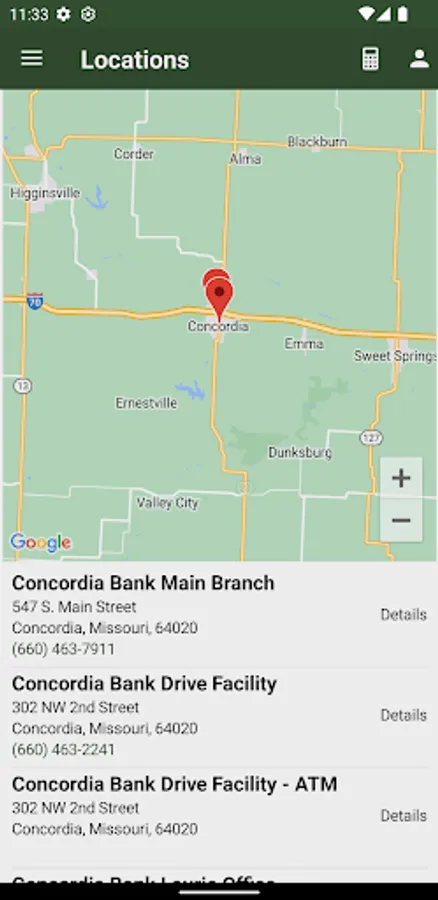 Contact: Locate ATMs or branches and contact Concordia Bank customer service directly from the app.