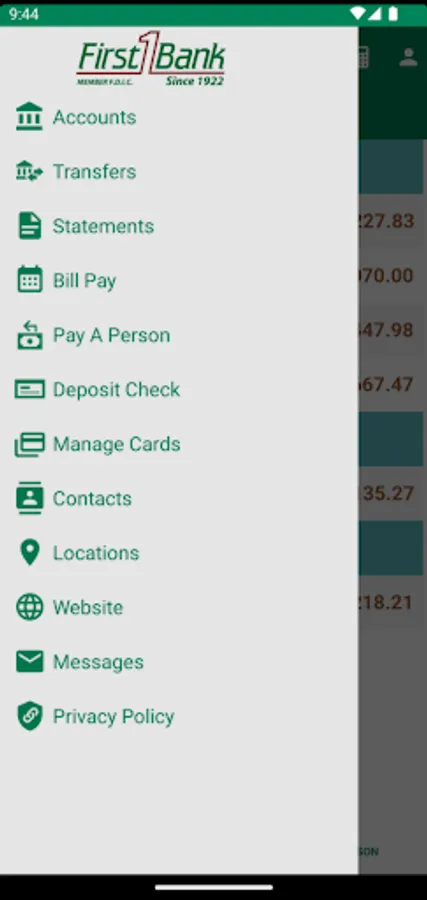 Contact: Locate ATMs or branches and contact First 1 Bank customer service directly from the app.