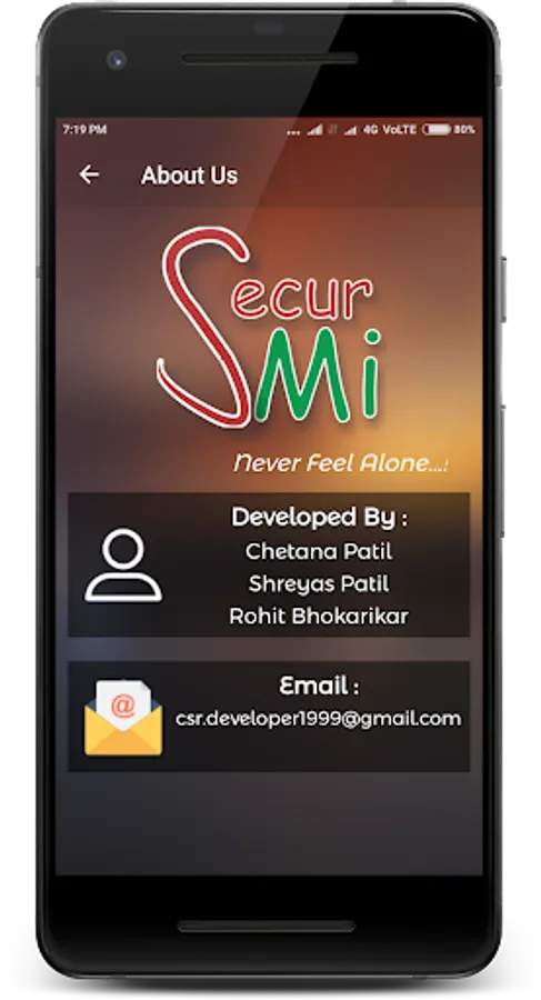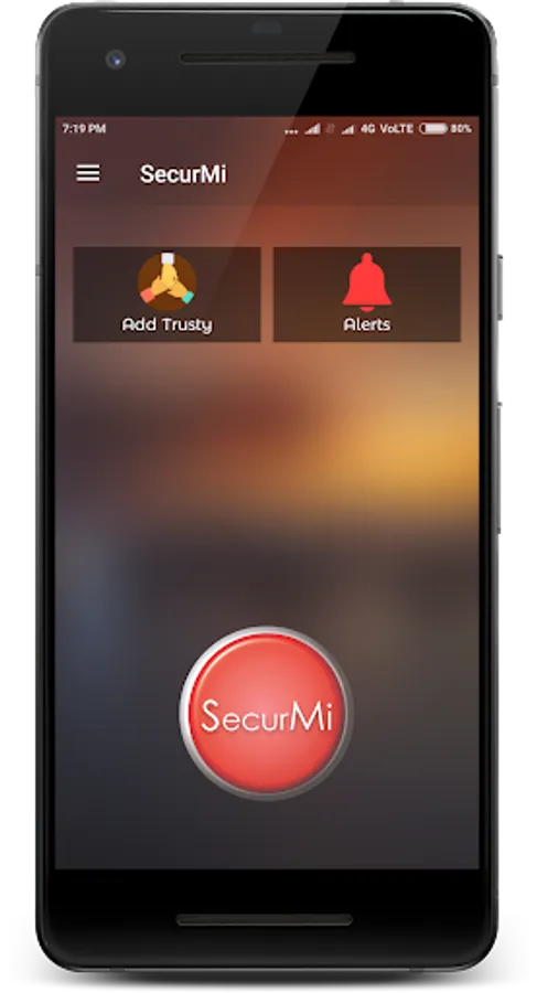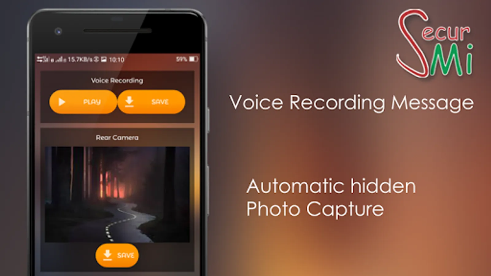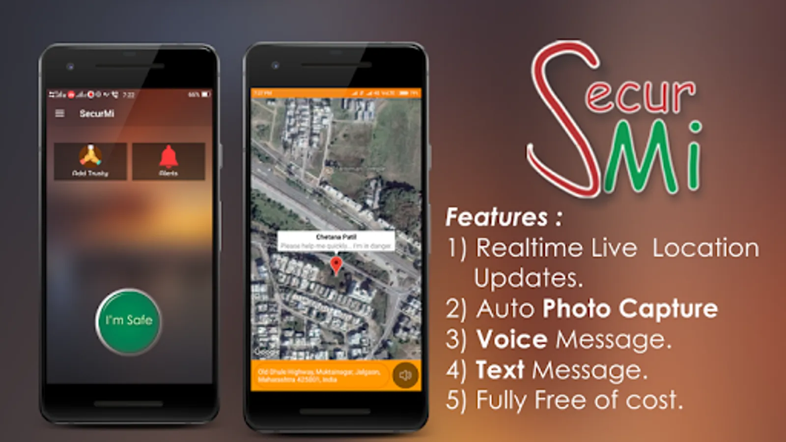 • If you feel you are in danger then just press 'SecurMi' red circle button, then text message to your trusty persons will send and app notification with live location, Voice recording of 10 seconds and photo with rear camera and front camera will also send.