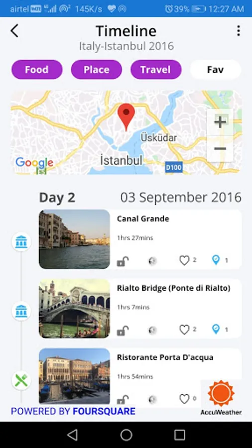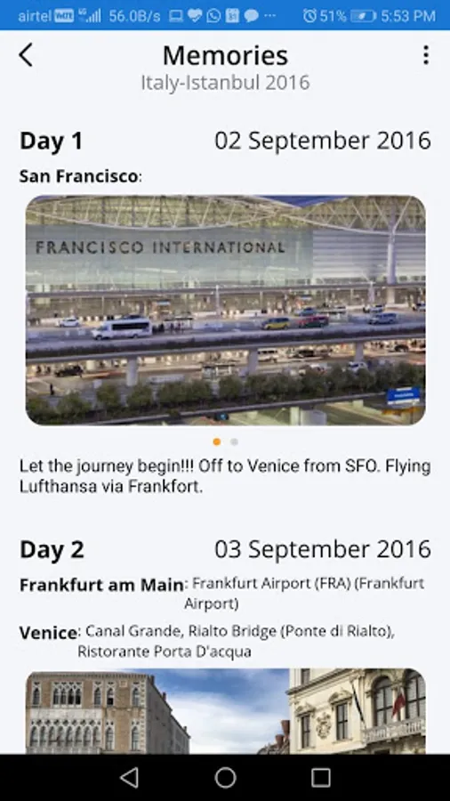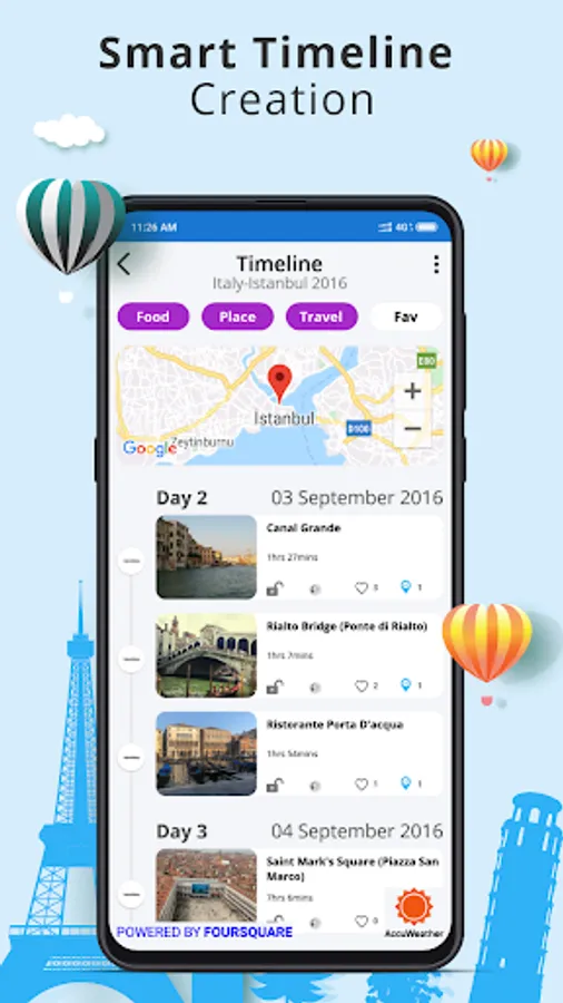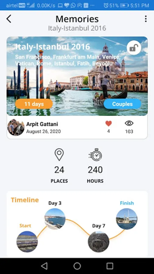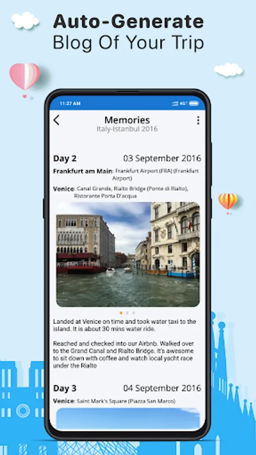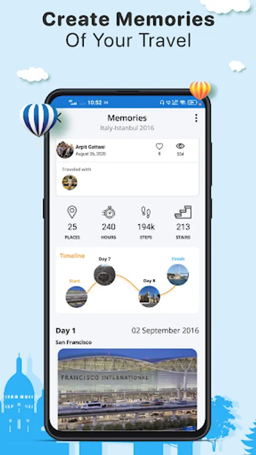 Once you start a new trip, Travelory will work in the background for you and log all your travel experiences. You can see the places you visited, the restaurants you dined in, the hotels you slept in and the time you spent doing all those activities. You can then select to add pictures, personalized notes and rate the place if you choose to. Once a trip is marked complete, an intuitive story will be generated which will keep the memories fresh forever.