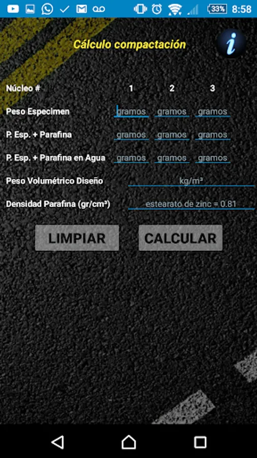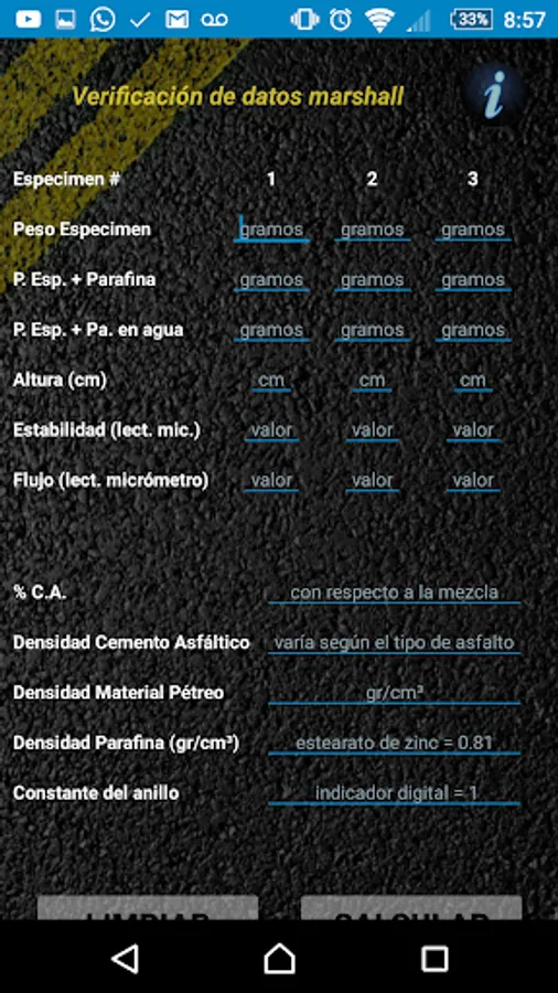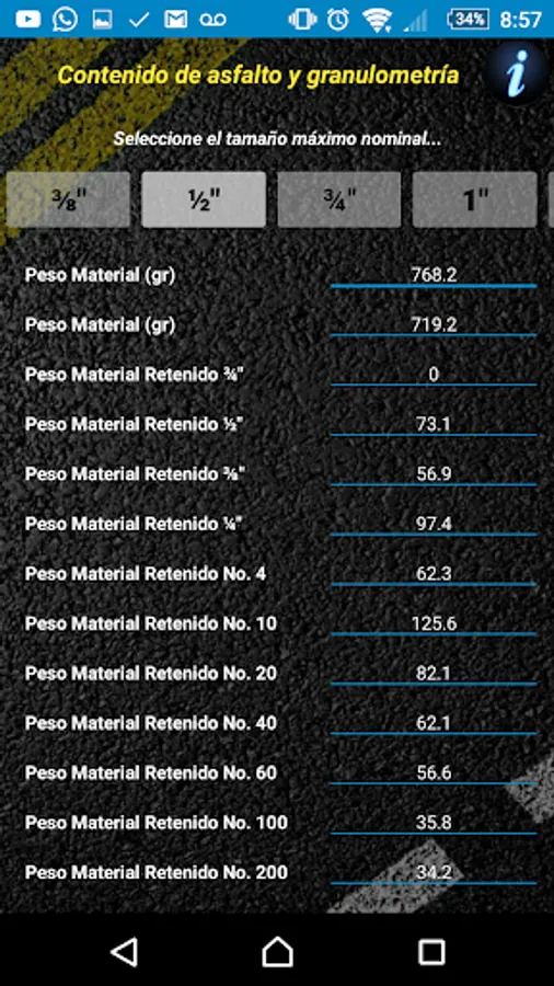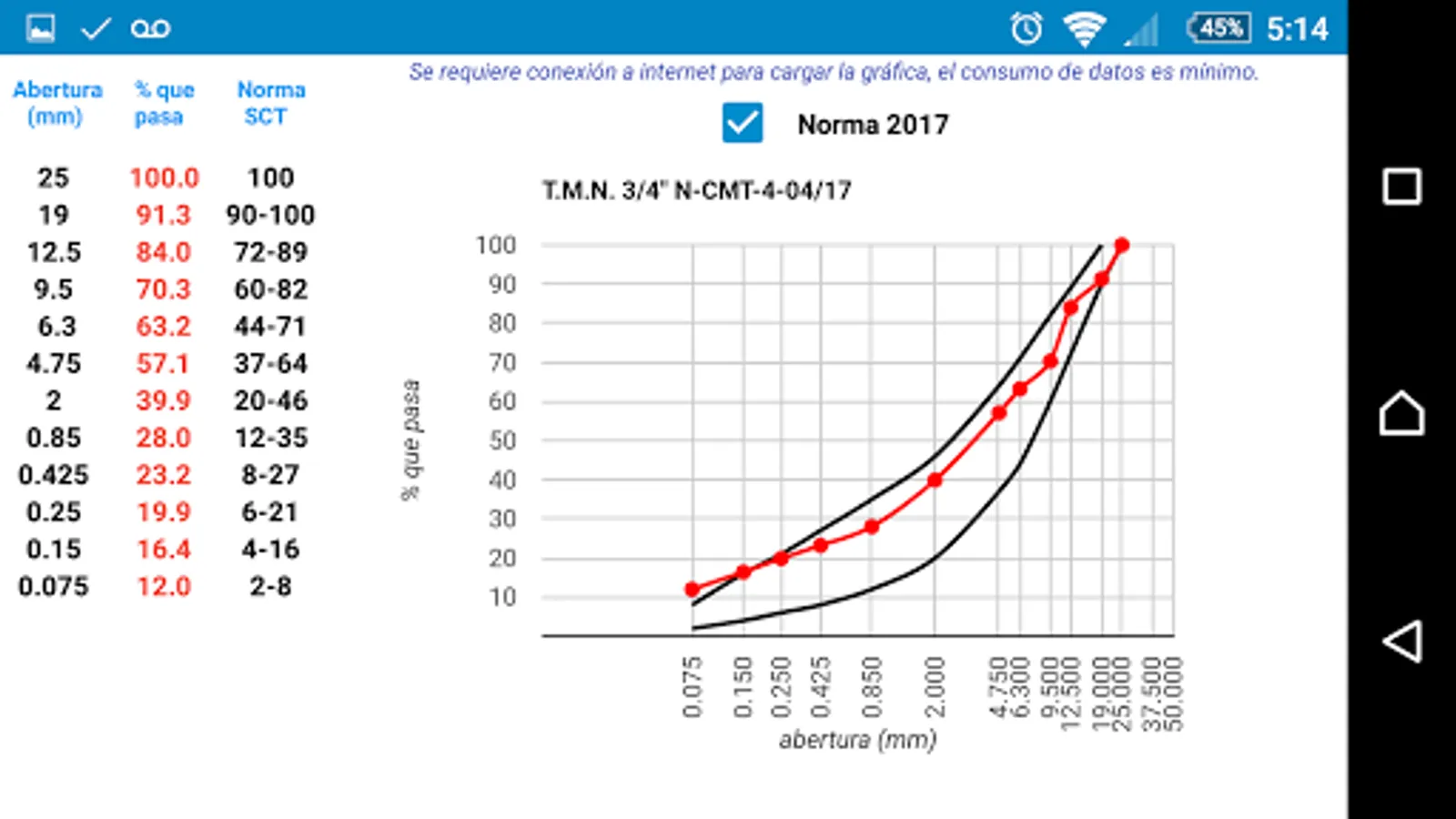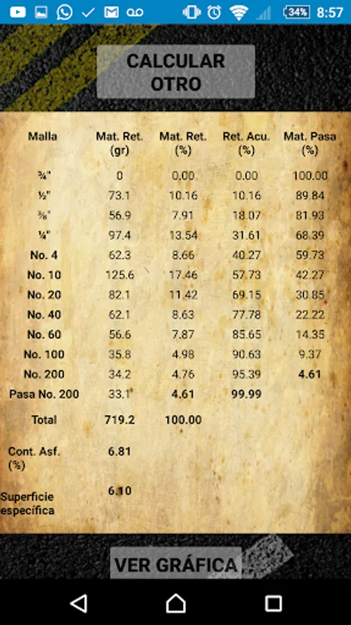 Calculate easily granulometrias, asphalt cement content, stability, flow, volumetric weights and granulometric graphs.