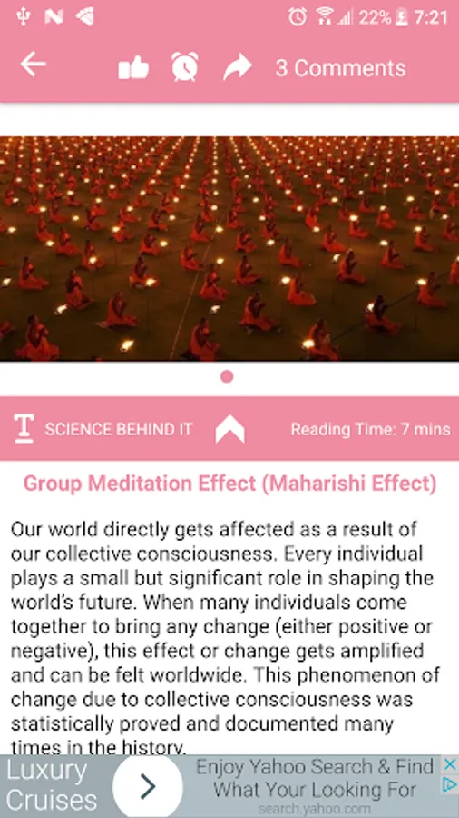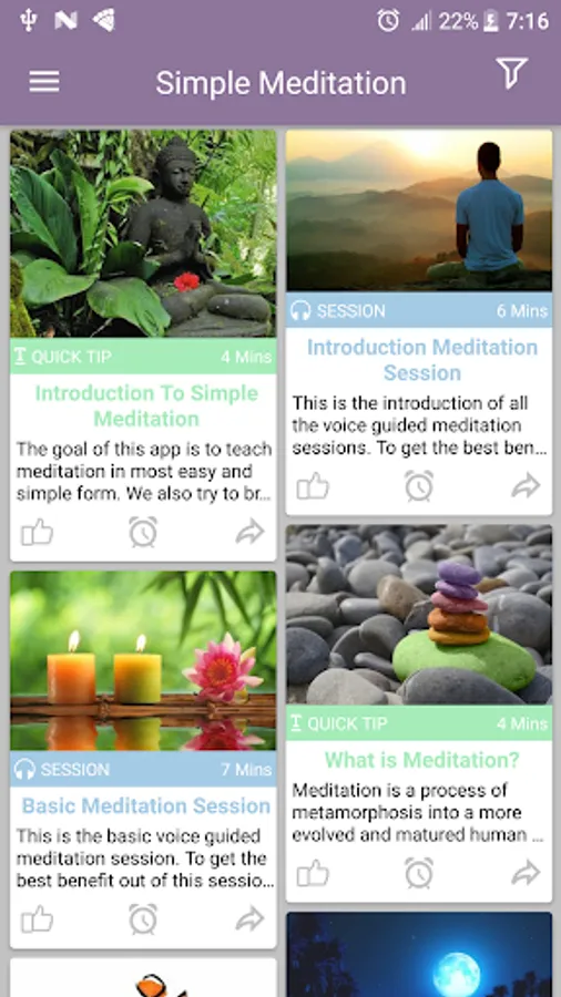 It explains what is meditation, types of meditation, posture of meditation, pyramid meditation, group meditation, and many more topics like these. Along with the voice guided meditation sessions, we also bring science behind the meditations and the results of any scientific research done on it. It contains, audio, videos and articles explaining every thing about meditation. These meditation techniques have been taken from Yoga, Transcendental, Zen and other meditation styles.