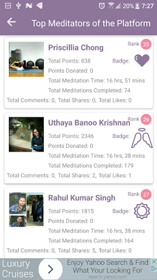 Meditation Leaderboard, where users are ranked on their meditation time and top meditators are shown with their rankings.