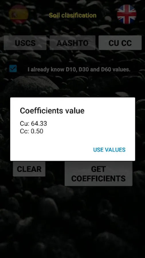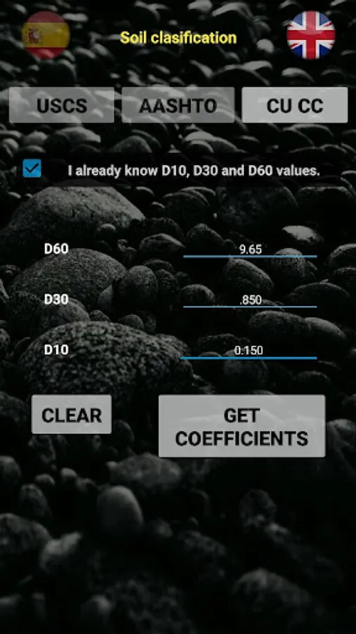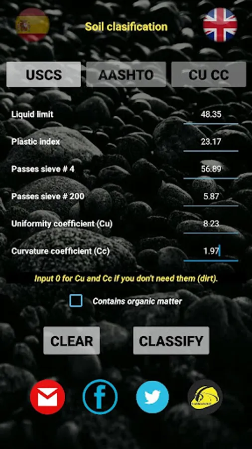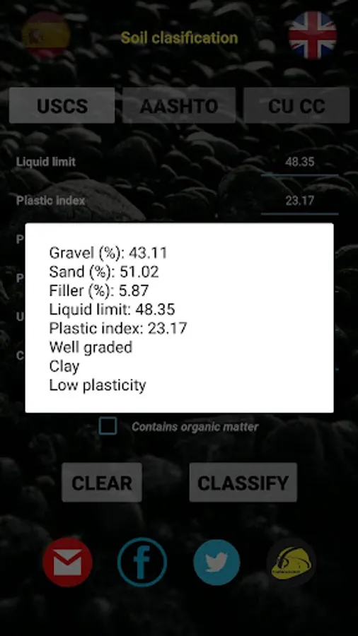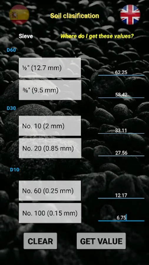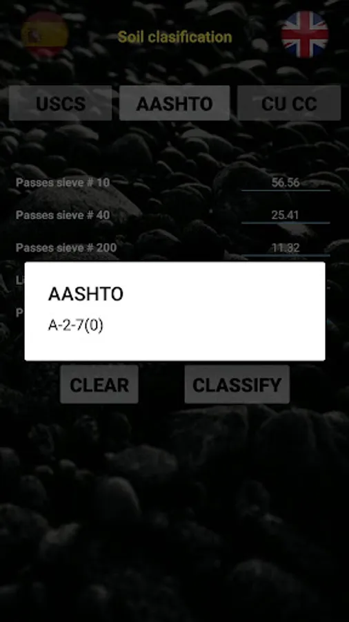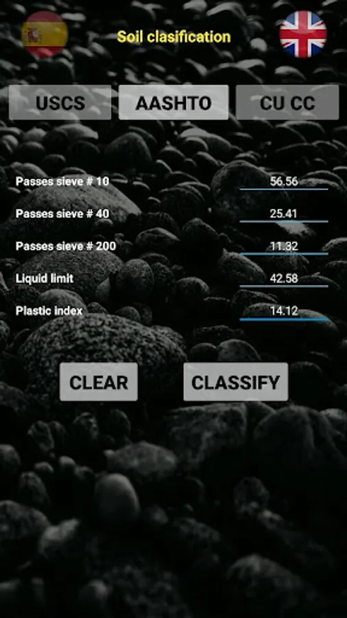 Clasify soil using USCS and AASHTO methods, get uniformity and curvature coefficients as well as D10, D30 and D60 values.