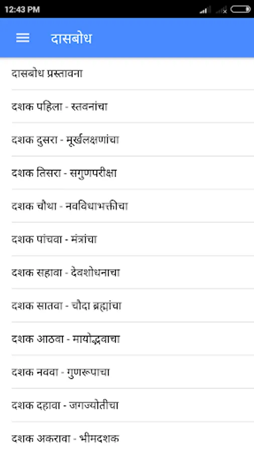 Granth Dasbodh comprises of 20 Dashakas or Chapters. Each Dashak has 10 Samas or sections.