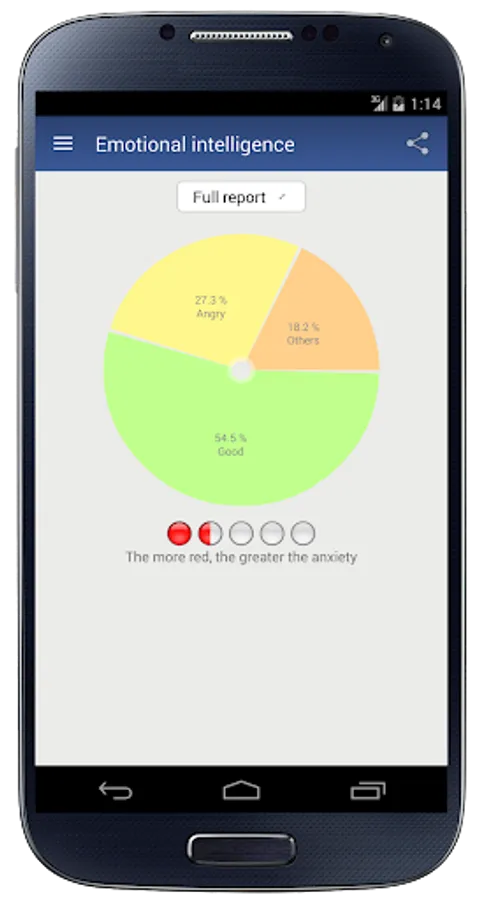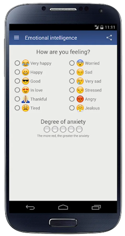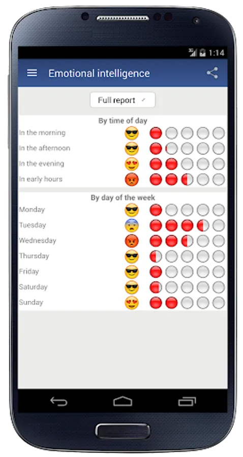 The main goal of this application is to help you have full awareness of your feelings. Self-awareness is the first step for those seeking a high level of emotional intelligence. Most of the time, we do not stop to think about how we are feeling. Be aware of your emotions helps you take action to change the situation. In the reports, you can view your progress (emotional balance) separated by months. So you will know yourself better. You will get motivated whenever necessary. You will have more empathy and will have better professional and personal relationships.