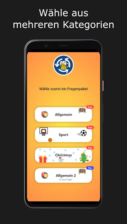 You can choose between different question packages. At the moment there are general questions, sports questions and Christmas questions.