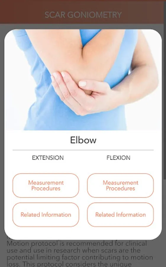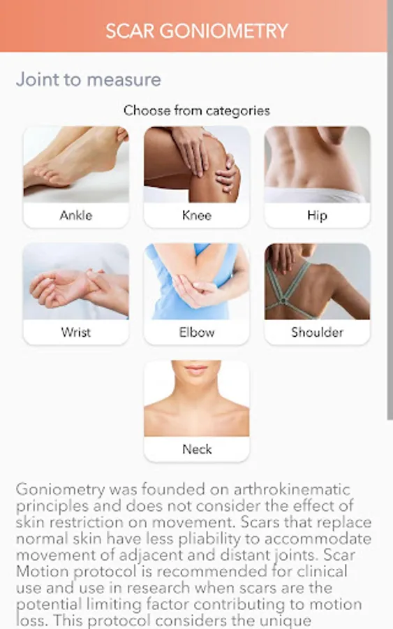 A goniometry guide for measuring range of motion or contracture when cutaneous scarring is present, such as with burn injury This app is designed to help guide providers in the correct positioning of patients.