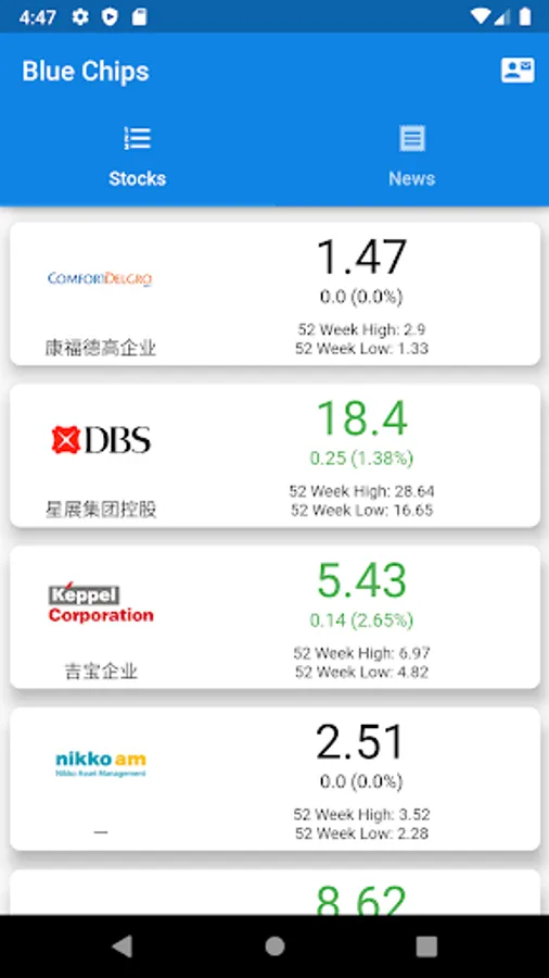 Any stock information provided in this app is for your information only, and we do not guarantee the accuracy. While blue chips generally has lower investment risk, one should always still invest with caution.