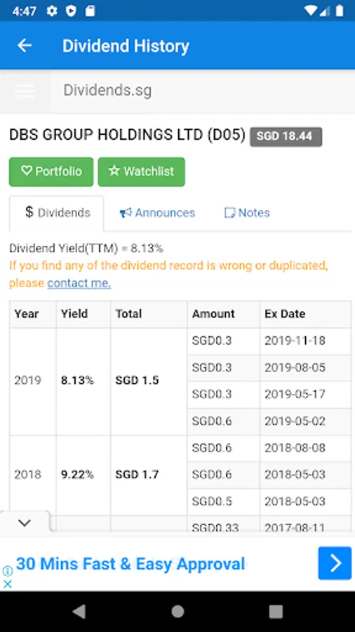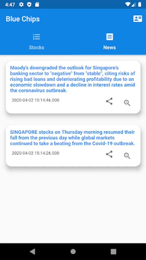 This app identifies the blue chips in Singapore and provides a quick glance of their stock price, dividend payout date and amount. In addition, it also provides a quick access to the STI.