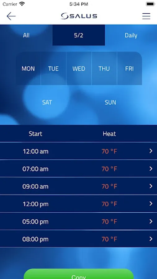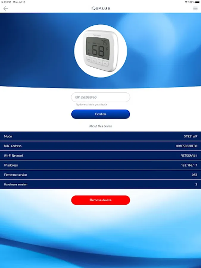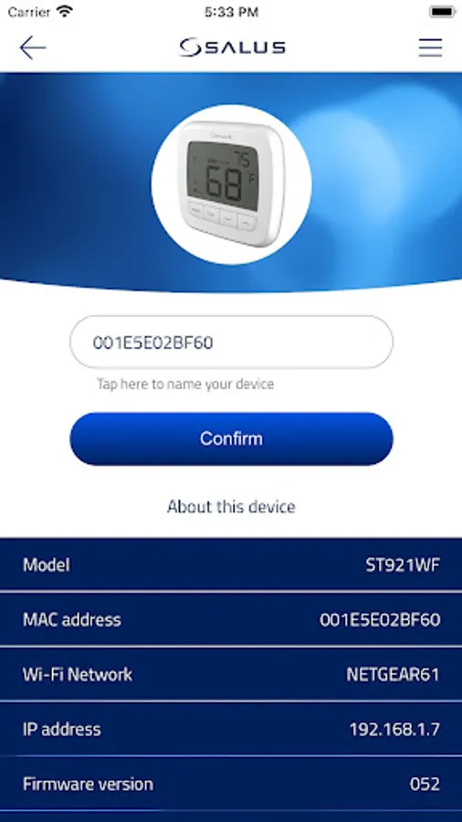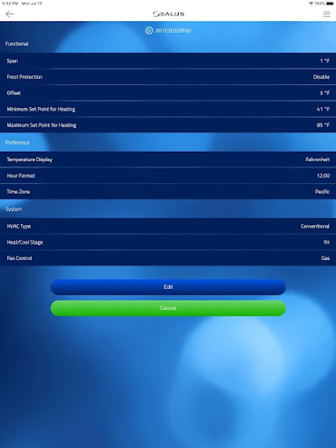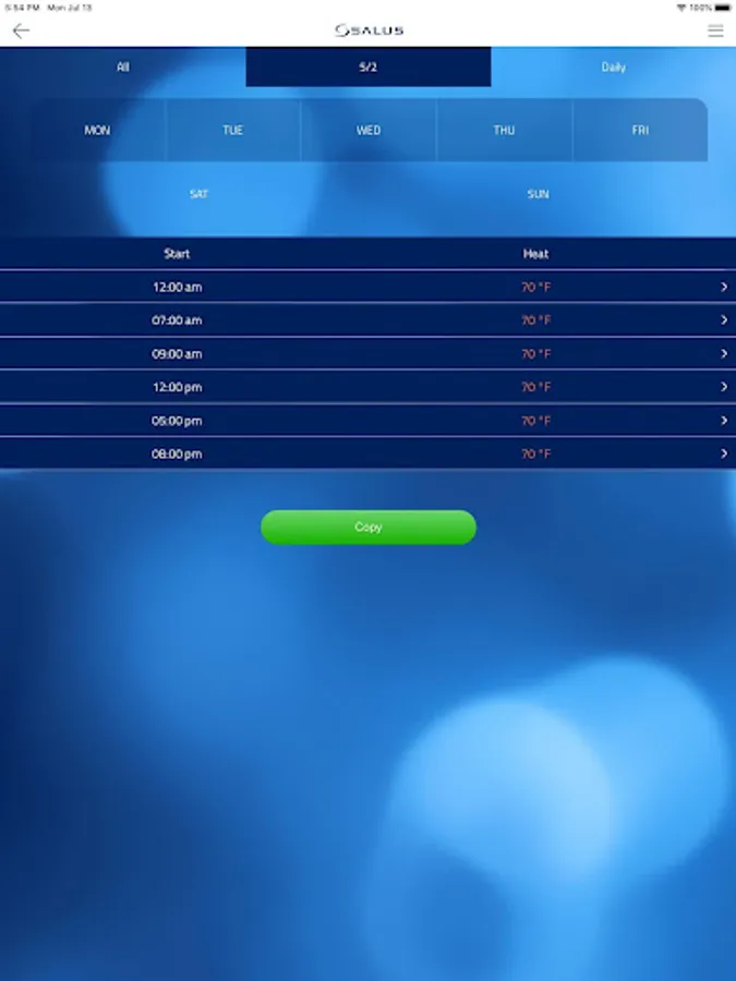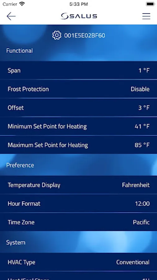 The SALUS SOLO app provides a clean interface with intuitive navigation to allow users to monitor and control the HVAC systems from any Android mobile device.  The App provides a simple and efficient view of the run-time status of multiple SOLO thermostats installed on you home WIFI network. One touch allows you to drill-down into any thermostat to view the operational status of your HVAC equipment, control the set-point temperature, heating and cooling mode and fan state and schedules. A detailed settings menu allows users to access, and alter, many of the system parameters right from your mobile device. A convenient Bluetooth interface provides a fast and efficient means of connecting the thermostat to the local Wi-Fi network.