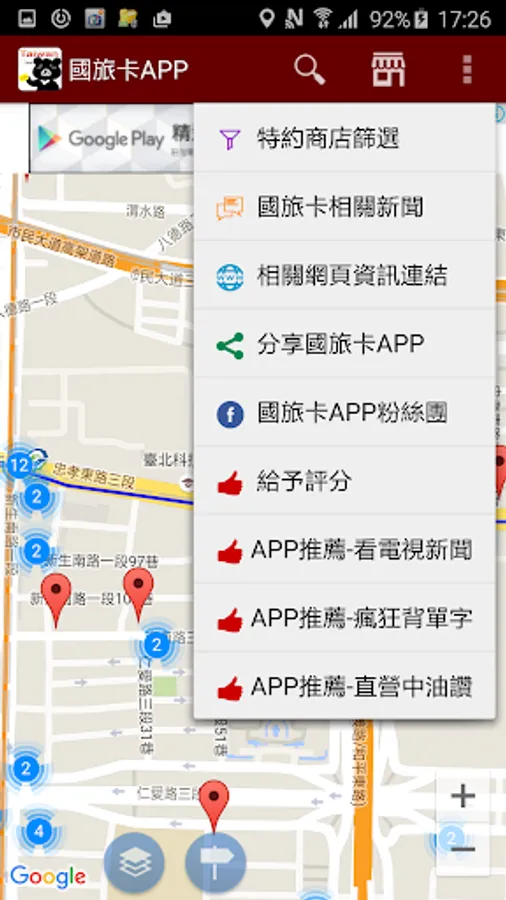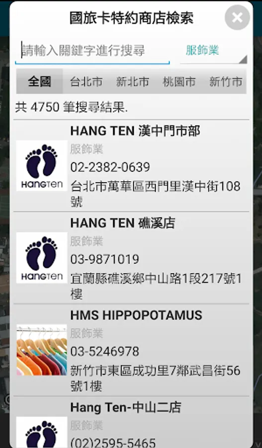 2. 提供特約商店檢索功能,可透過關鍵字以及縣市設定,方便直接尋找國旅卡特約商店