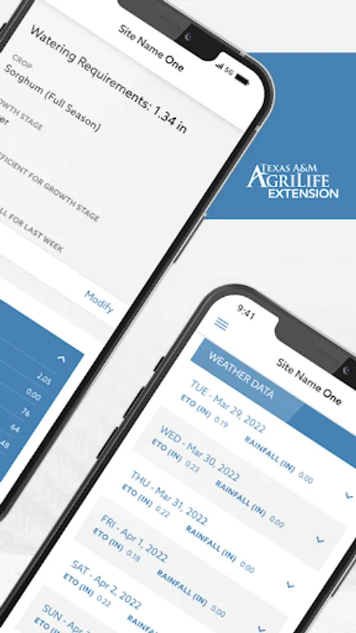 Texas ET contains weather information, current and average evapotranspiration data, and irrigation watering recommendations. Set weekly reminders to get notified of crop watering recommendations.