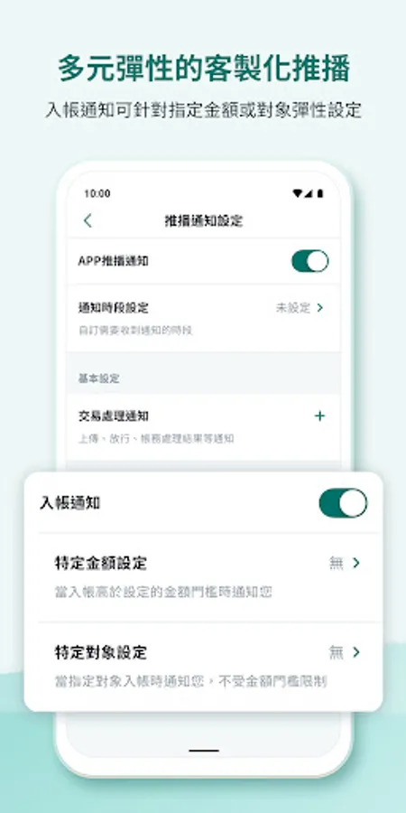 ●Customized push notification setting: Advanced setting of fund-related notifications-receipt notification and fund water level reminder notification.