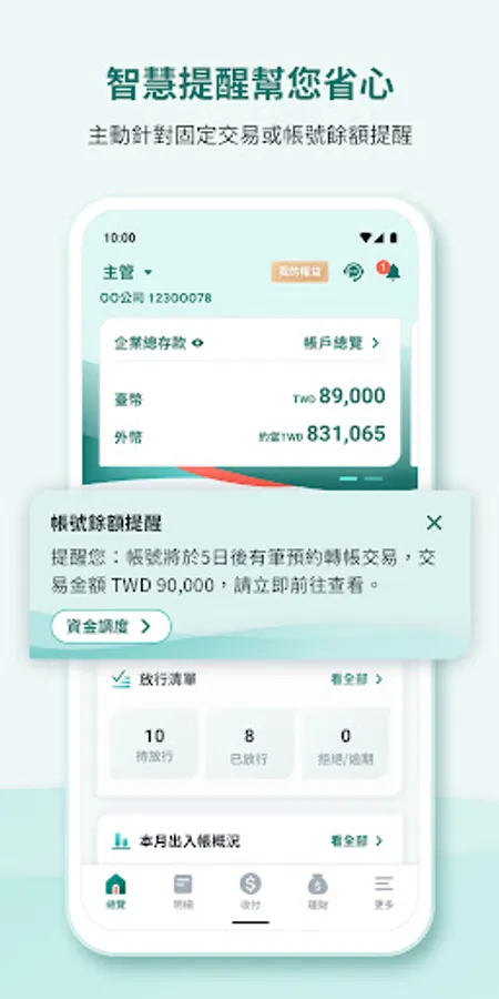 ●Smart Transaction Reminder: Automatic notification of insufficient scheduled transaction balance or recurring transactions.