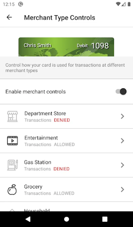 Spending limits can be established to allow transactions up to a certain dollar value and decline transactions when amounts exceed your defined thresholds. Transactions can be monitored and managed for specific merchant categories such as gas stations, department stores, restaurants entertainment, travel, and groceries. And your transactions can also be monitored for specific transaction types: in-store purchases, e-commerce transactions, mail/phone orders and ATM transactions.