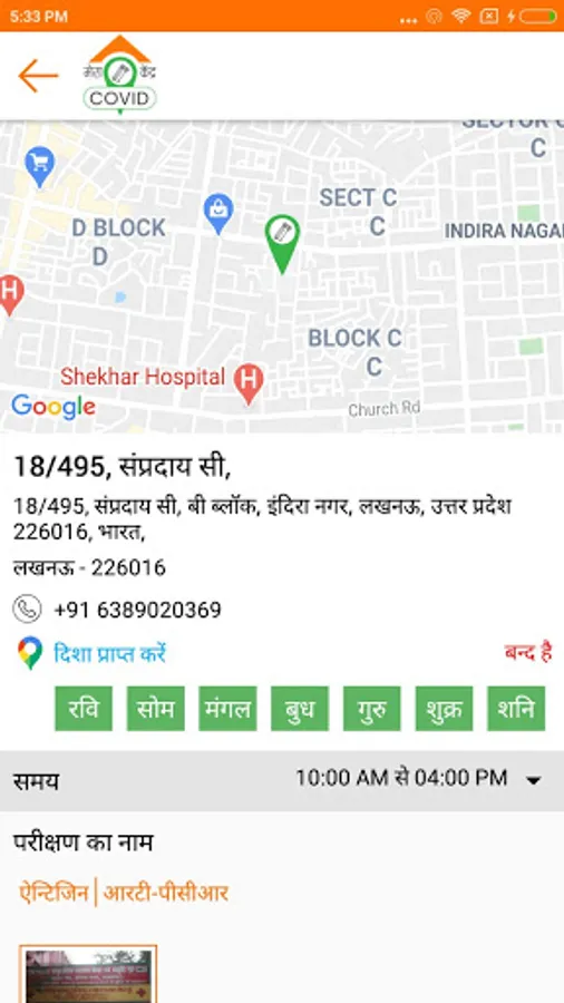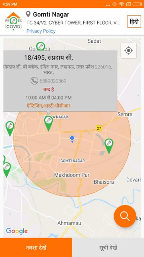 The "Mera Covid Kendra" app can be utilized to find Testing Centres within a default vicinity of 5 kms. The user can see the testing centres on app through Map or list view and also get details of testing centre(contact, timing, test type etc) in the area.