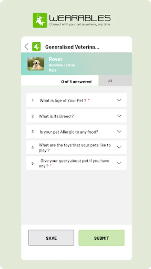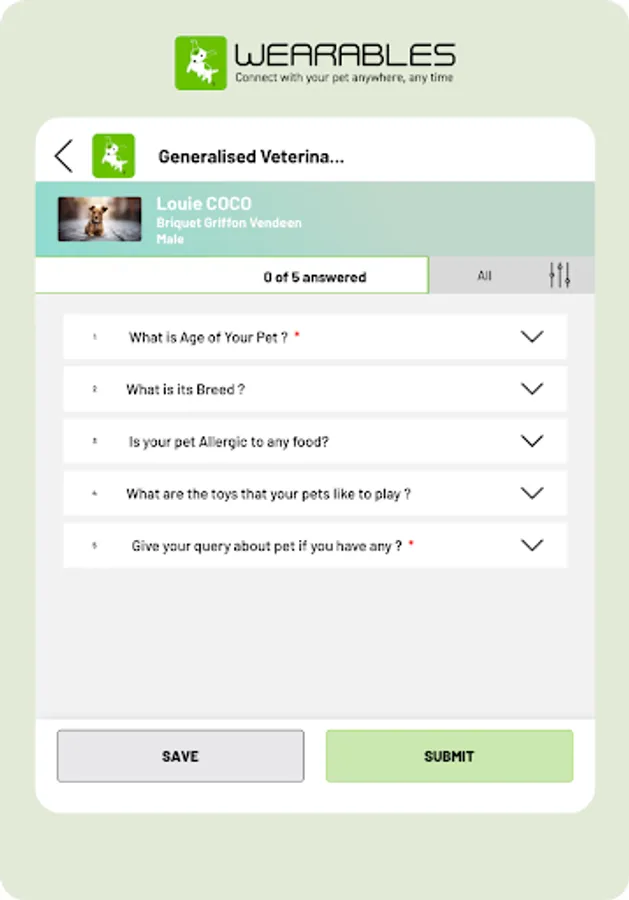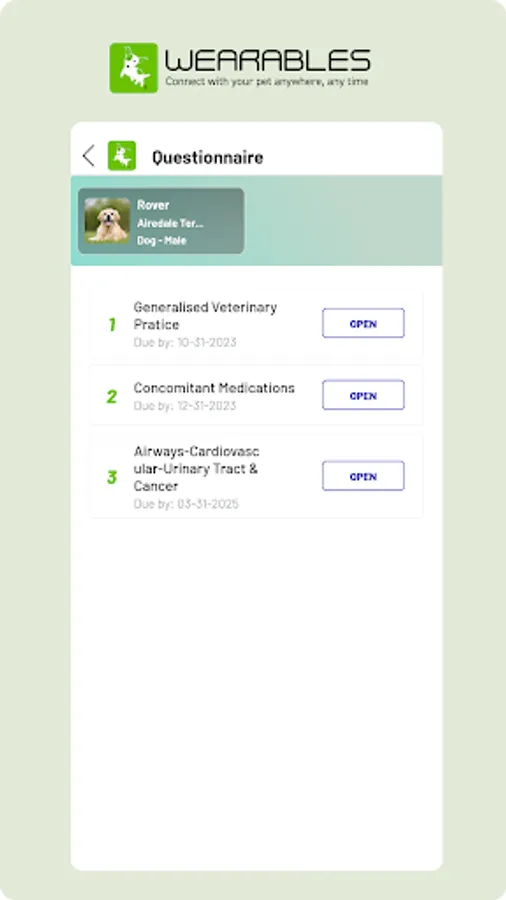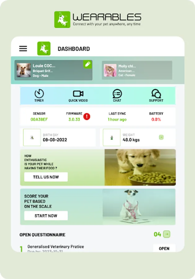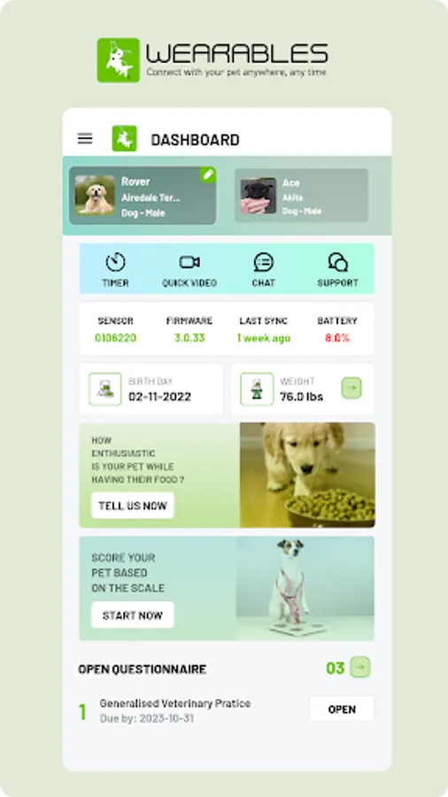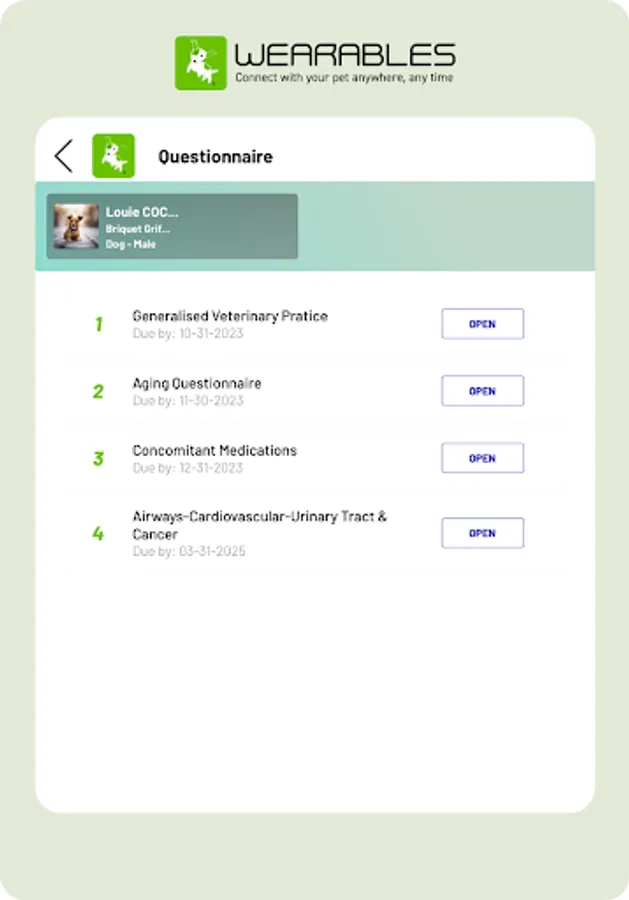 The Wearables Clinical Trial (WCT) App allows pet owners to participate in studies with their pet. It can be used to set up a wearable sensor, upload photos or videos and answer questionnaires related to the study their pet is enrolled in.