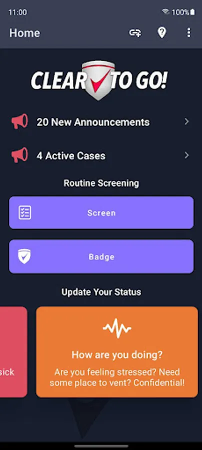 The CLEAR TO GO!™ App connects with the CTG enterprise service for managing entry and safe usage of commercial facilities by presenting a series of questions deemed necessary by the facility to comply with federal, state and local guidelines as directed by the facility's legal & compliance team.