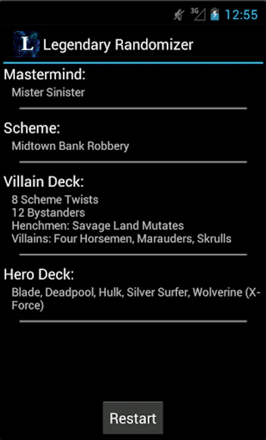 Tired of trying to pick masterminds, schemes, and heroes for your Marvel Legendary card games? This free *unofficial* app makes it quick and easy to get up and running with minimal input and maximum output. Simply pick the number of players and the app will select a Mastermind and a Scheme, then automatically assign Villains, Henchmen, and even build out your Hero Deck for you, all with instructions on Scheme Twists and any other special rules applied by the Scheme.