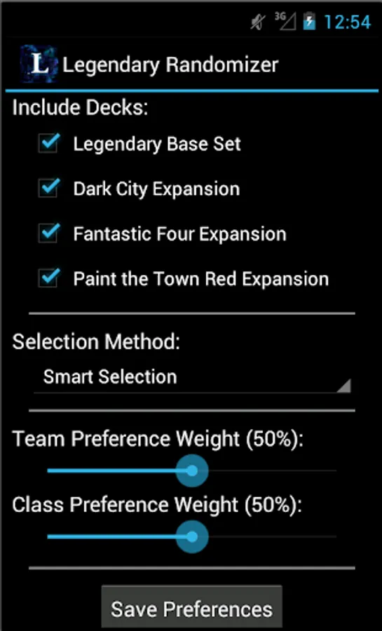 The settings for the app allow you to choose from any of the supported expansions (Dark City, Fantastic Four, Paint the Town Red, Villains, Guardians of the Galaxy, Fear Itself, and Secret Wars Vols. 1+2, Captain America 75th Anniversary, Civil War, Deadpool, Marvel Noir, World War Hulk, Marvel Studios Phase 1, Spider-M-Man Homecoming, Ant-Man, Venom, Dimensions, Revelations, and Heroes of Asgard, New Mutants, Into the Cosmos, Realm of Kings, Messiah Complex, Doctor Strange and the Shadows of Nightmare, MCU Guardians of the Galaxy, Black Panther, Black Widow, Infinity Saga, Sons of Midnight, and the rare 3D promo cards) as well as the Base Legendary set, and to configure the Smart Selection method to increase or decrease the Team and Class preference assignments.