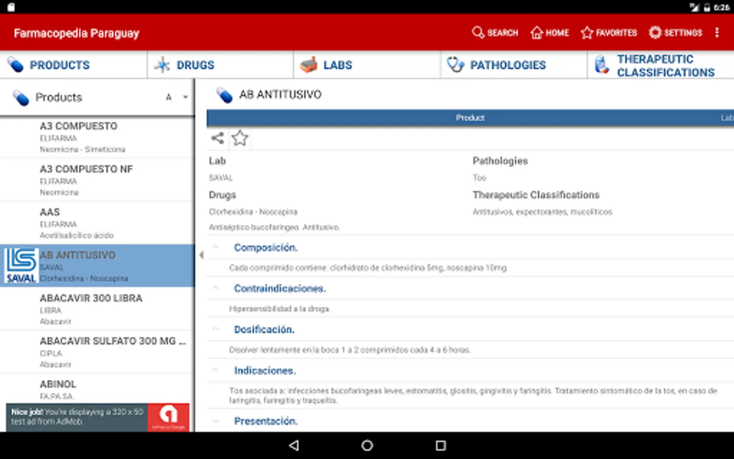 Catalog of medicines sold in Paraguay, searchable by trade name, drug, lab, pathology and therapeutic classification.