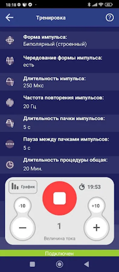 "PelvicMan" is an application with which you can control the "PelvicControl" myostimulator (belongs to the class of physiotherapy devices). The general principle of the simulator is myostimulation and massage of the internal cavities in the area of the pelvic floor muscles. The application contains 4 blocks of procedures. You can independently adjust the current strength for a comfortable workout. The procedure does not cause discomfort and does not take much time. The duration of the procedures is up to 20 minutes. As a result of the regular use of the PelvicControl muscle stimulator, the muscles will become stronger, gain elasticity, their strength and endurance will increase, and blood circulation will improve.