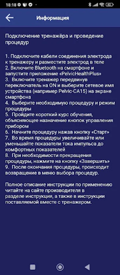 The application works in conjunction with the simulator - myostimulator "PelvicControl", allows you to control all the functions of the simulator via the Bluetooth protocol, and also helps to visualize the process of muscle tension and control the load.