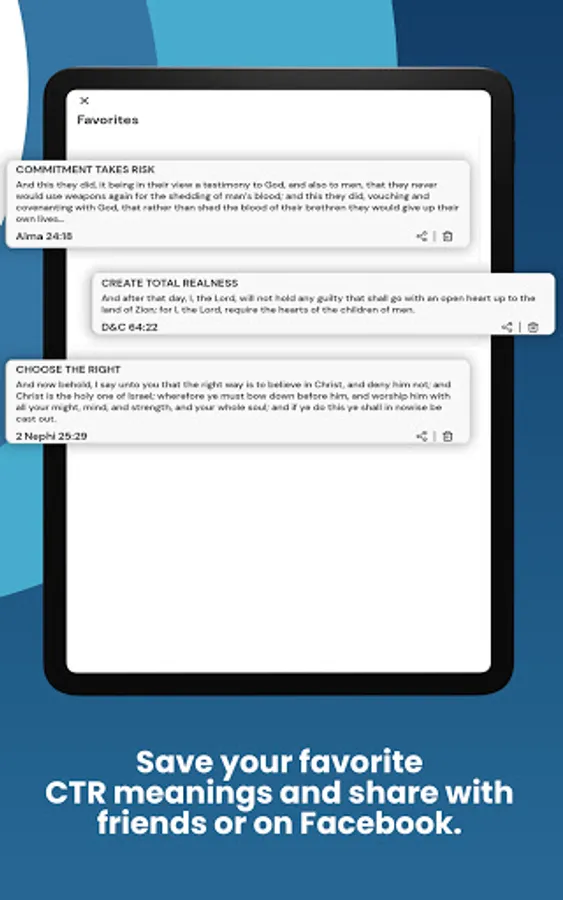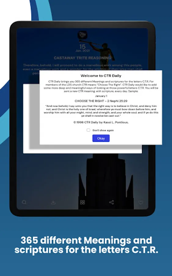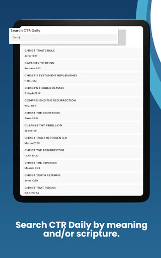 CTR Daily brings you 365 different Meanings and scriptures for the letters C.T.R. For members of the LDS church CTR means “Choose The Right”. CTR Daily would like to add some more deep and meaningful ways of looking at those powerful letters C.T.R. You will be sent a new CTR meaning, with scripture, every day. Sample: