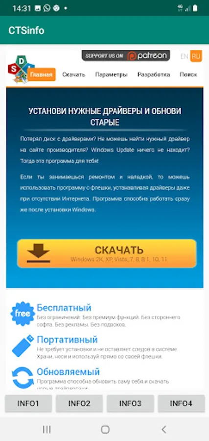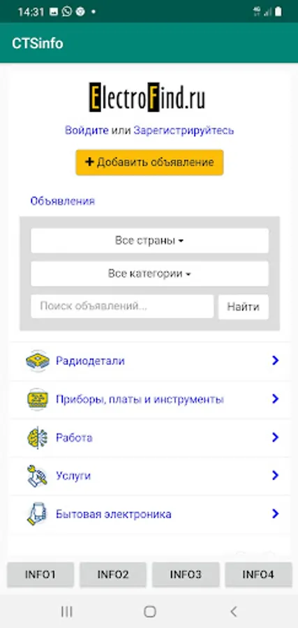 The application allows you to view 4 sites (using the buttons Info1, Info2, Info3, Info4) containing information about radio engineering, household appliances, computers and communications.