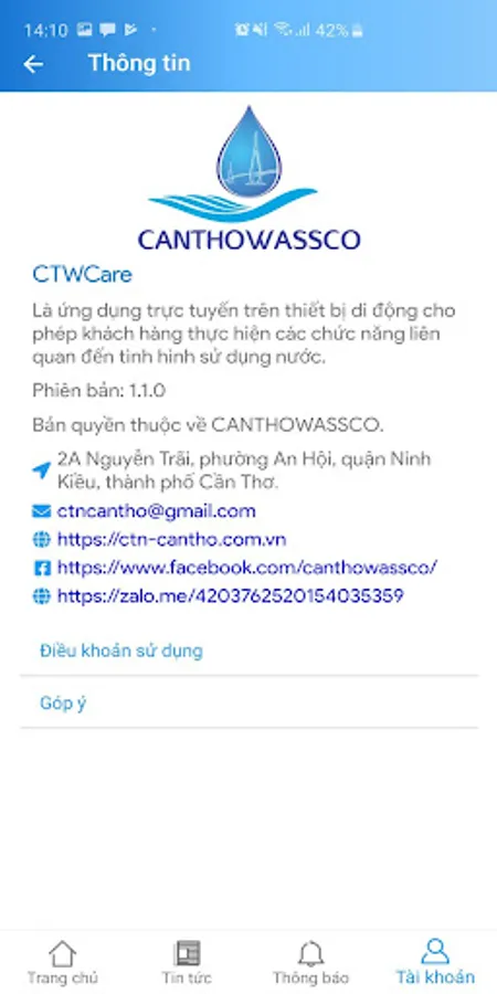CTWCare là kênh dịch vụ chăm sóc khách hàng của Công ty Cổ phần Cấp thoát nước Cần Thơ, ứng dụng cho phép Khách hàng sử dụng điện thoại di động có kết nối Internet (Wifi/3G/4G) để thực hiện các dịch vụ khách hàng trực tuyến. Theo đó Khách hàng có thể giao tiếp với công ty dễ dàng, thuận tiện, mọi lúc, mọi nơi, tiết kiệm thời gian và chi phí. Ứng dụng tương thích với tất cả dòng điện thoại thông minh sử dụng 2 hệ điều hành Android, iOS. Tính năng nổi bật: