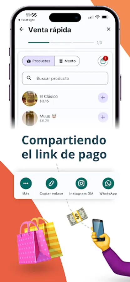Send a payment link or your whole catalogue via WhatsApp, Instagram, email or any other means.