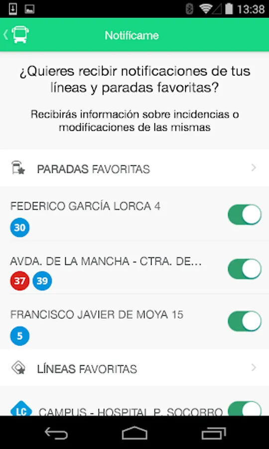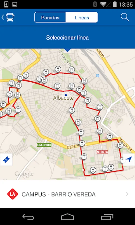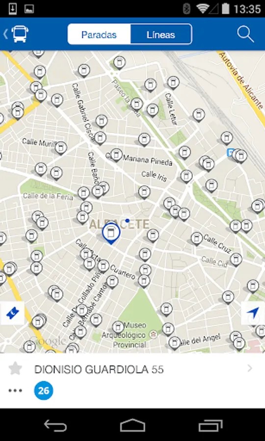 official transport buses in Albacete, app for locals and visitors can access from your mobile to all updated information on lines, stops, waiting times, incidents, nearby points of interest and even estimating savings of C02 emissions information. Practical and easy to use. The application has the following sections: