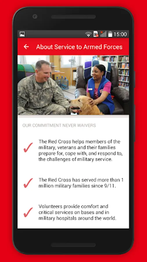 The app also guides users through the various services offered by the Red Cross to assist families before, during and after deployments, as well as containing a variety of other critical information:VA facilities locations, benefits information, mental health/substance abuse and job resources.