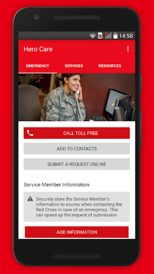 The Red Cross is the only civilian organization authorized to serve as the emergency communications link to service members with their families back home. Hero Care enables families to easily set up and submit an emergency request should circumstances at home require it - 24 hours a day, 365 a year, no matter where in the world service members are stationed.