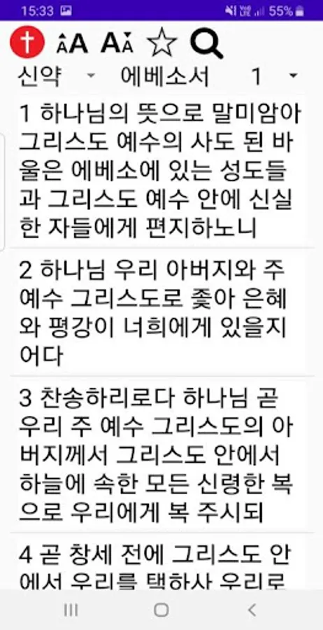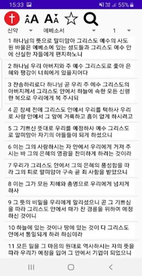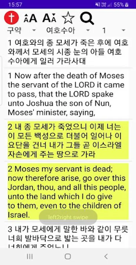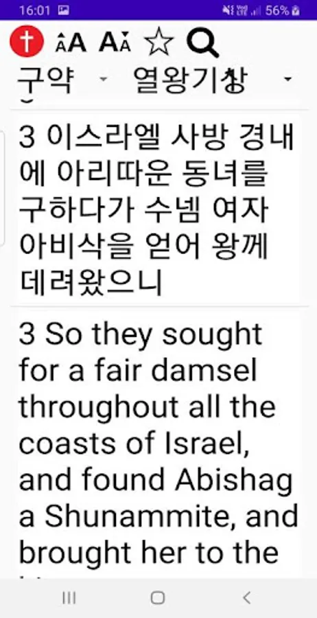 Bible First is a very easy to use and convenient app. It contains the Korean Bible and the English Bible, so you can see both Bibles at the same time, and you can see the difference between Korean and English translations. It is very convenient for the elderly to enlarge the text.