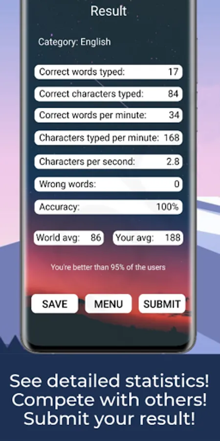 By submitting your result you will be able to see your rank in the world and the list of top 10 users for every category!