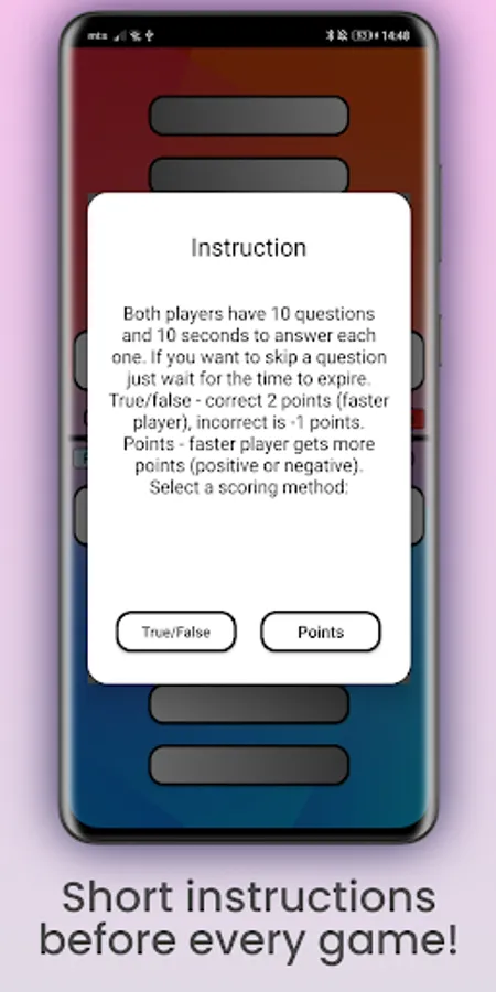 ◾True/False - if both players answer correctly, the faster player gets two points. If the answer is incorrect, the player gets -1 point, if the player did not answer the question, his points do not change.