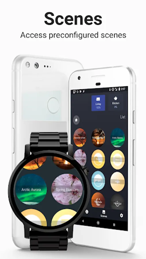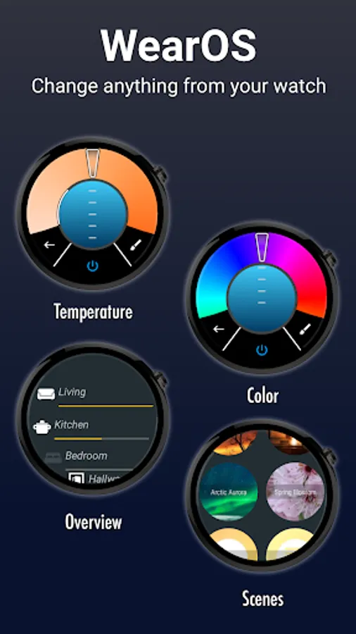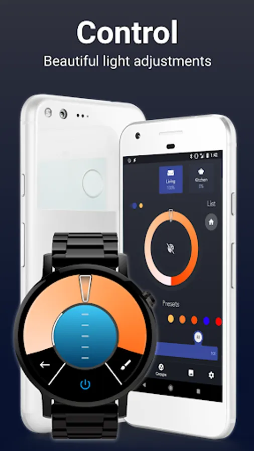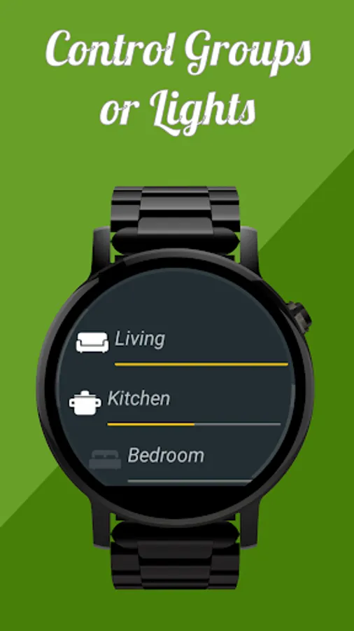 Simply connect to your Hue bridge using your phone and start controlling your Hue light bulbs from the comfort of your wrist.