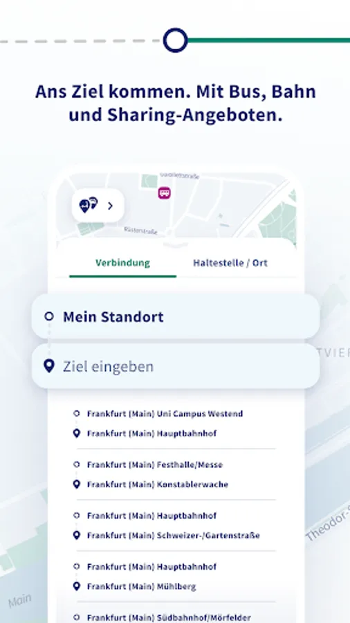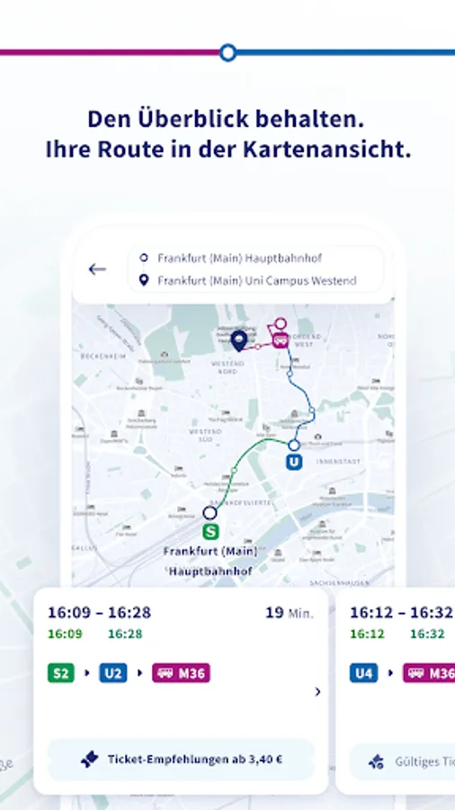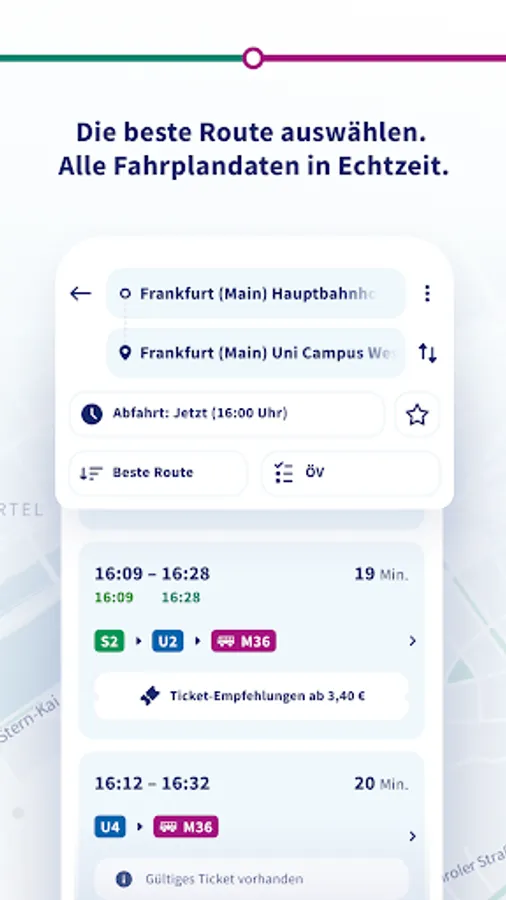 So you can be on the go easily, quickly and without cash. Enter your desired destination and have the current connection information for bus and train displayed directly from your location. With just one click you can orientate yourself on the map view. If necessary, you can combine your connection with sharing offers or have a footpath displayed. Real-time data with current traffic reports and load forecasts help you plan the best route.