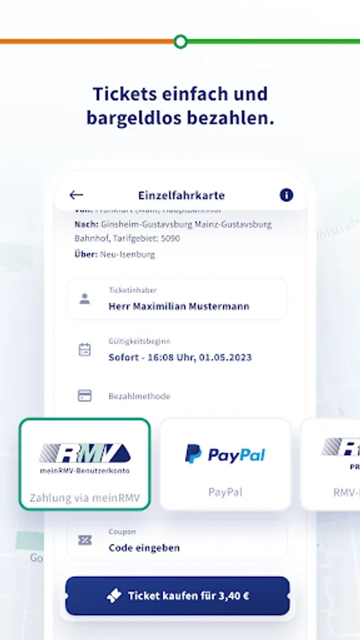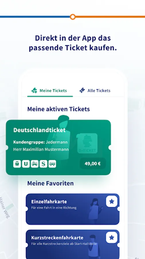 The appropriate RMV ticket will be displayed to you directly. Single tickets, day tickets, weekly, monthly and annual tickets for adults and children as well as group day tickets, the Hessenticket, the RMV SparPass and the Deutschlandticket can be purchased in RMVgo.